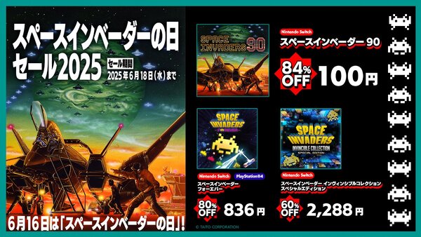タイトーは6月4日、6月16日の「スペースインベーダーの日」を記念して、対象のNintendo Switch用ソフト(ダウンロード版)およびPlayStation 4用ソフト(ダウンロード版)が最大84%オフとなる「スペースインベーダーの日セール2025」を開催。セール期間は、2025年6月18日まで。