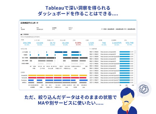 多くの企業で、Tableauを活用して顧客データや広告データを統合したダッシュボードを構築し、データドリブンな意思決定を行っています。しかし、ダッシュボード上で得られた洞察を外部のシステムで実際のマーケティング施策に活用する際には、データの再抽出・加工・インポートといった手作業が必要となり、せっかくの分析結果を迅速に施策へ反映することができないという課題がありました。