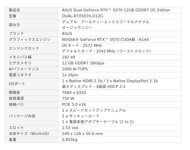 「TUF-RTX5070TI-O16G-WHITE-GAMING」「DUAL-RTX5070-O12G」