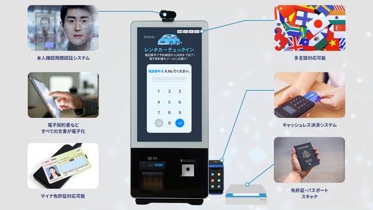 また、多言語機能(英語・中国語(繁体字)・韓国語)を備え、2025年5月よりマイナ免許証対応機能も追加。レンタカー受付業務の効率化と省人化をサポートします。