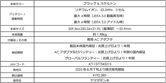 本体デザインの大きな特徴として、ディスプレイ側面や本体底面にスケルトンカバーを採用するほか、WASDや方向キーなどにスケルトンキートップを搭載し、他には無い独特な個性を放ちます。本体は薄さ22.9mm・軽さ1.98kgの薄型・軽量デザインとなっており、室内の移動やバックパックへ収納して外出先へ気軽に持ち運ぶことができます。