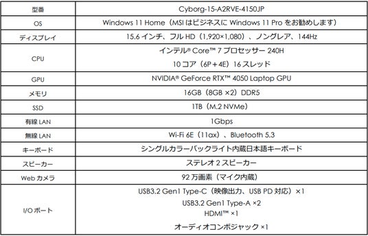 ・Cyborg 15 A2RV シリーズ製品ページ:https://jp.msi.com/Laptop/Cyborg-15-A2RVX