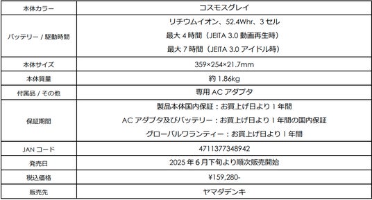 薄さ21.7mm・軽さ1.86kgの本体はバックパックへ簡単に収納でき、外出先へ気軽に持ち運べるコンパクトなデザインも大きな特徴となっています。