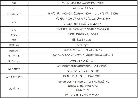 ・「Core(TM) Ultra 9 プロセッサー 275HX」と「GeForce RTX(TM) 5090 Laptop GPU」の組み合わせで上位モデルに匹敵する性能を実現