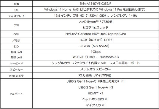 ・「AMD Ryzen(TM) 7 7735HS」と「GeForce RTX(TM) 4050 Laptop GPU」を搭載しつつ、税込み価格17万円以下のリーズナブルな価格を実現
