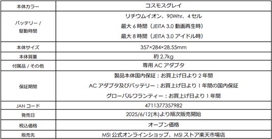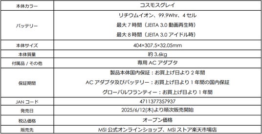 この他、ウルトラハイスペックゲーミングノートPC「Vector 17 HX AI A2XW」、薄型・軽量ゲーミングノートPCの「Thin 15/A15」各シリーズのバリエーションモデルを2025年6月12日(木)より順次販売開始いたします。
