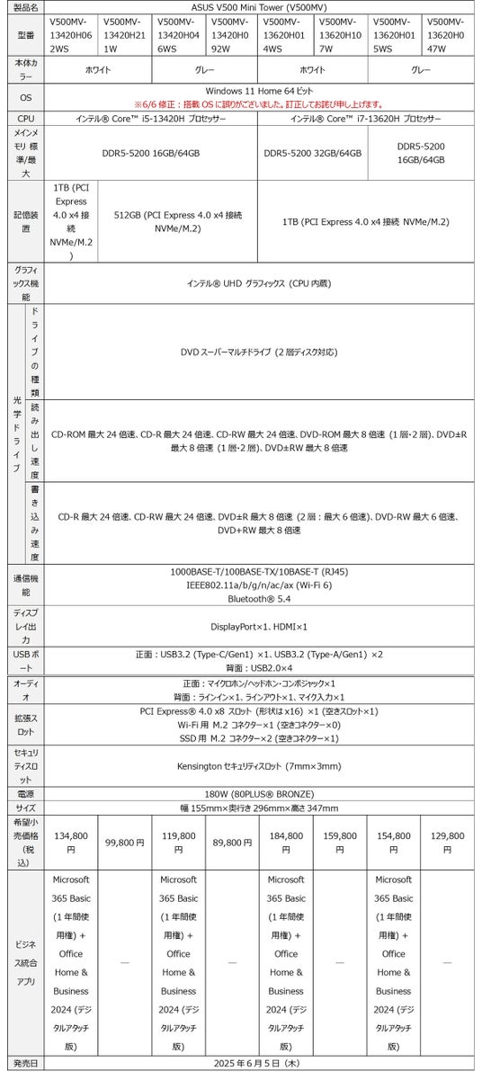 「ASUS V500 Mini Tower (V500MV) 」は、本日2025年6月5日 (木) より発売します。
