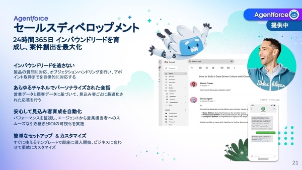 そこに加わったのが、創業時からの本丸といえるセールス領域の「Agentforce for Sales」である。現在、インサイドセールスをこなす「セールスディベロップメント」を国内提供しており、エージェントとのロープレ(ロールプレイング)トレーニングが可能な「セールスコーチング」も2025年内に提供予定だ。