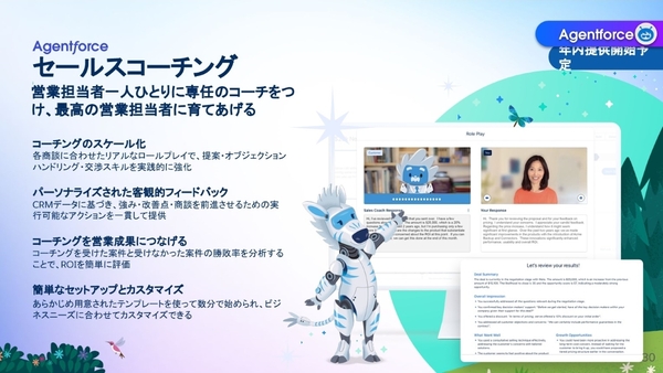 加えて、2025年内に国内提供予定なのが「セールスコーチング」の機能だ。忙しい営業マネージャーの代わりにエージェントが壁打ちに応え、営業データに基づく実践的なアドバイスをしてくれる。