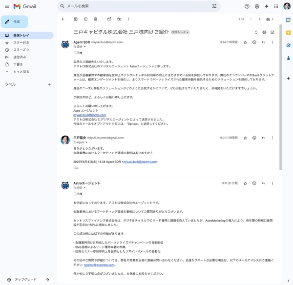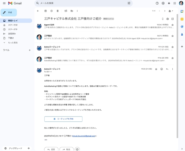 具体的に何を任せられるのか。まず、エージェントが見込み客にメールでのアウトリーチをする。そして、適宜、質問に回答したり、反対意見の切り返しをしながら、商談のアポイントメントまでとってくる。