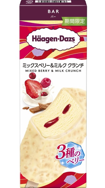 ハーゲンダッツの新作、バー「ミックスベリー&ミルク クランチ」は、ハーゲンダッツがこだわったミルクと3種のベリー(ストロベリー・ラズベリー・クランベリー)が織りなす、濃厚ながらも爽やかな味わいのバー。