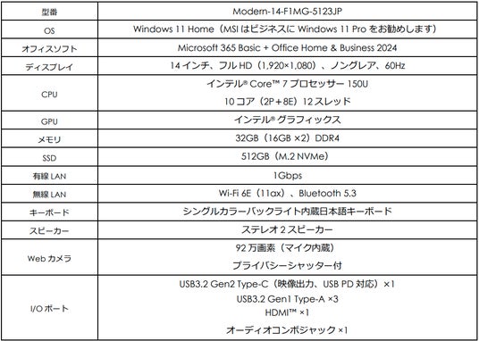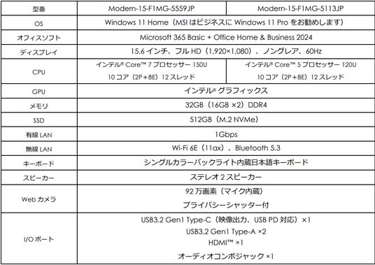 ・「Modern-15-F1MG-5559JP」「Modern-15-F1MG-5113JP」「Modern-14-F1MG-5123JP」は、「Microsoft 365 Basic + Office Home & Business 2024」をプリインストール