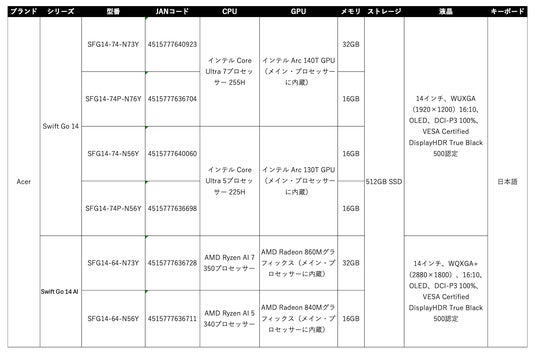 AIノートPCシリーズ「Swift Go 14」の最新6機種6月6日より発売開始!Core Ultra Hシリーズプロセッサー、Ryzen AI 300シリーズプロセッサー搭載
