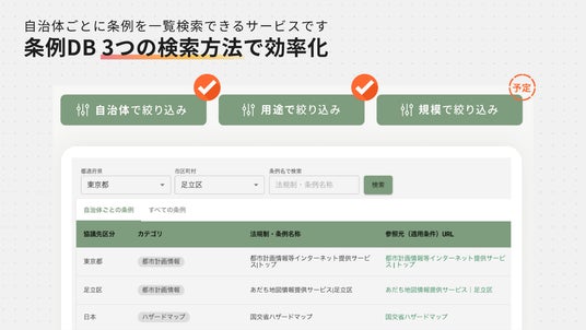「条例DB」は不動産事業者、建築主向けの、建築に関わる条例調査を効率化するWebサービスです。