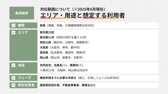 「条例DB」では現在、より満足してお使いいただけるように、自治体と用途を限定してデータベースを整備しています。今後も首都圏エリアを集中に拡大予定です。