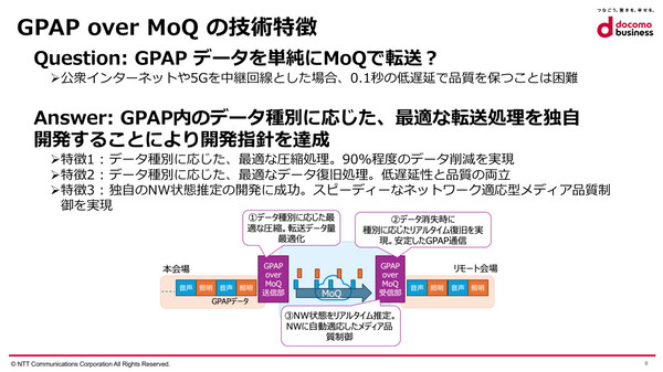 今回のGPAP over MoQは、この2つのプロトコルをベースとして、インターネットや5Gといった品質にばらつきのある回線でも利用できるよう、「データ圧縮の最適化」「データロスのリアルタイム復元」「ネットワーク品質に適応したメディア品質制御」の各機能を追加している。