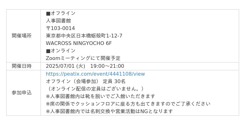 2024年4月1日に東京人形町にオープンした、人事関連職が集まるコワーキング×コミュニティ。2500冊以上の人事に関する書籍と600名以上の会員を有しており「仲間と学びで、未来を拓く」をスローガンに運営している。