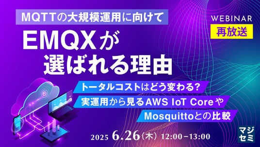 マジセミ株式会社は、大変好評をいただいた「【再放送】【MQTTの大規模運用に向けて】EMQXが選ばれる理由」というテーマのウェビナーを再放送します。