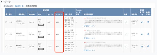 今回「プライスサーチ byGMO」に新たに実装した「クーポン情報取得」機能では、ECサイトを回遊し対象商品に適用されるクーポンの情報を店舗ごとに表示し、価格調査結果画面に反映します。