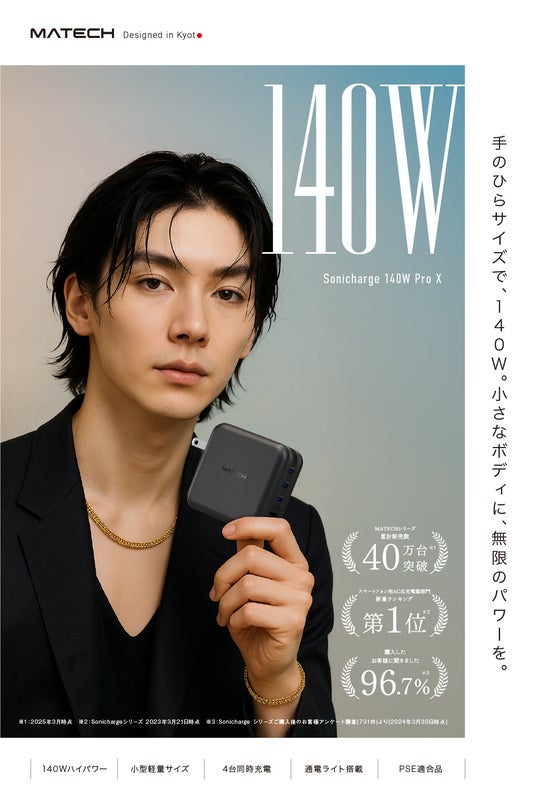 デジタルガジェットの企画開発を行う MATECH株式会社(本社:京都市下京区)は、USB Power Delivery 3.1対応の最大140W出力・4ポート搭載の高性能充電器「Sonicharge 140W Pro X」を、2025年6月よりAmazon.co.jpにて販売開始しました。