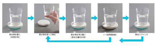 1日のおすすめ水分量を設定することで、以下の流れで定期的な水分補給を促します。飲み忘れ防止機能として、一定時間経過するとコースター(LED)とアプリ(通知)で飲水タイミングをリマインドします。