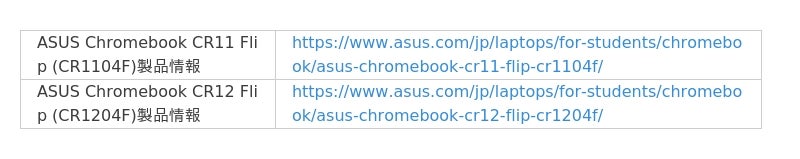 ○ASUS Chromebook CR11 Flip(CR1104F)CR1104FTAシリーズ11.6型 / ASUS Chromebook CR12 Flip(CR1204F)CR1204FTAシリーズ 12.2型ディスプレイ搭載製品の主なスペック