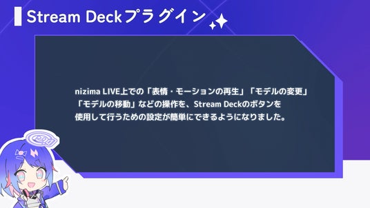 nizima LIVE上での「表情・モーションの再生」「モデルの変更」「モデルの移動」などの操作を、Stream Deckのボタンを使用して行うための設定が簡単にできるようになりました。