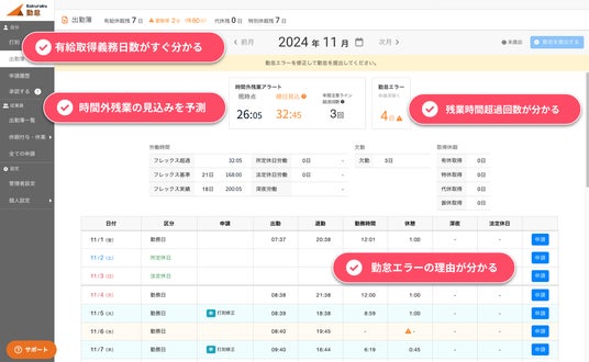 36協定や有給休暇取得義務の遵守状況の把握・管理は担当者の手作業に依存していましたが、「バクラク勤怠」の導入により、これらの状況を従業員・管理者双方が管理画面でリアルタイムで可視化できるようになります。また、時間外残業については申請時点で見込み予測として表示されるため、違反を未然に防止し、労務管理の適正化を実現します。