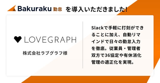 すべての経済活動のデジタル化を目指す株式会社LayerXは、勤怠管理サービス「バクラク勤怠」が、株式会社ラブグラフ(代表取締役:駒下純兵、本間達也、以下「ラブグラフ」)に導入されたことをお知らせします。