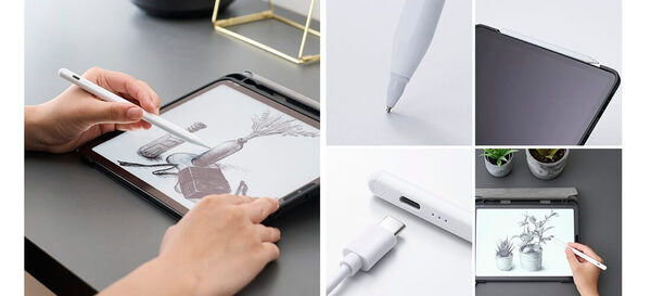 また、このアクティブタッチペンは、充電用のUSB Type-Cポートを備え、約20分でフル充電が可能となっており、1回の充電で約9時間の連続使用が可能である。側面にはiPadに吸着できるマグネット面を持ち、テーブルに置いても転がりにくいD型の形状を採用。また、電池残量を4段階のLEDで確認できる機能も備えている。