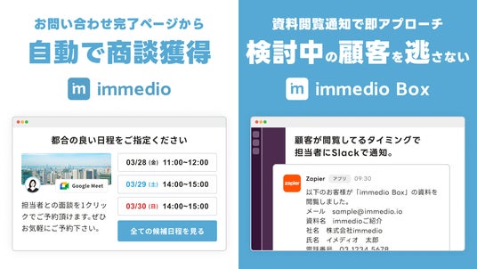 「immedio」、「immedio Box」により、Web、資料上での商談の取りこぼしをなくし、商談獲得を自動させることでセールスの属人化、テレアポ・メールなど非効率な営業活動といった課題を解決し、営業・マーケティング組織の生産性向上に貢献します。