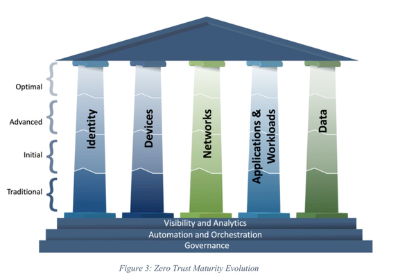 米国のCISA(社会基盤安全保障庁)では、2023年4月に「ゼロトラスト成熟度モデル Ver.2.0(ZTMM2.0)」をリリースしました。ZTMM2.0では「可視性と分析」「自動化とオーケストレーション」「ガバナンス」を土台として、「アイデンティティ」「デバイス」「ネットワーク」「アプリケーションとワークロード」「データ」の5つの柱に沿って、「従来レベル(Traditional)」「初期レベル(Initial)」「応用レベル(Advanced)」「最適レベル(Optimal)」の4段階で成熟度が定義されています。