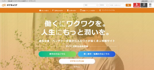 チアキャリアは地方創生と教育をテーマに『働くにワクワクを。 人生にもっと潤いを。』増やすための働く選択肢が広がることを目的とした、年間10万人が利用するベンチャー・成長企業にフォーカスした就職サイトです。