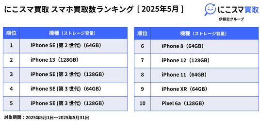 中古スマートフォンの個人向け販売・買取サービス「にこスマ」を運営する株式会社Belong(所在地:東京都港区、代表取締役社長 西村 耕一郎 以下、当社)は、にこスマにおける2025年5月の中古スマホ/機種別販売数・買取数ランキングを発表いたします。
