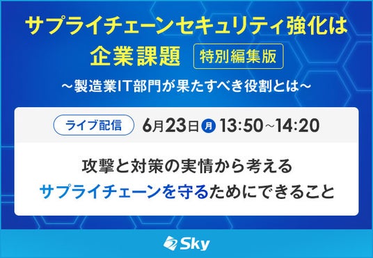 Sky株式会社は、2025年6月23日(月)に開催される、ITmedia エンタープライズ主催のライブ配信セミナーイベント「サプライチェーンセキュリティ強化は企業課題~製造業IT部門が果たすべき役割とは~特別編集版」に協賛いたします。