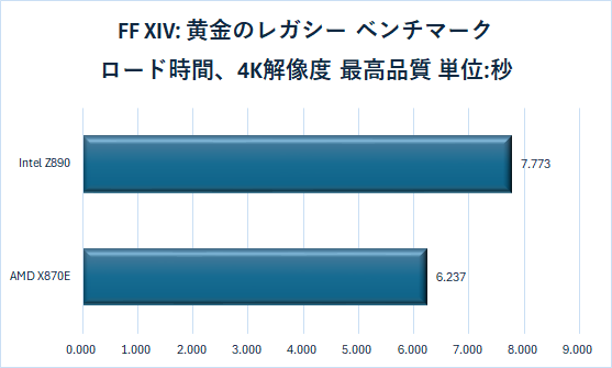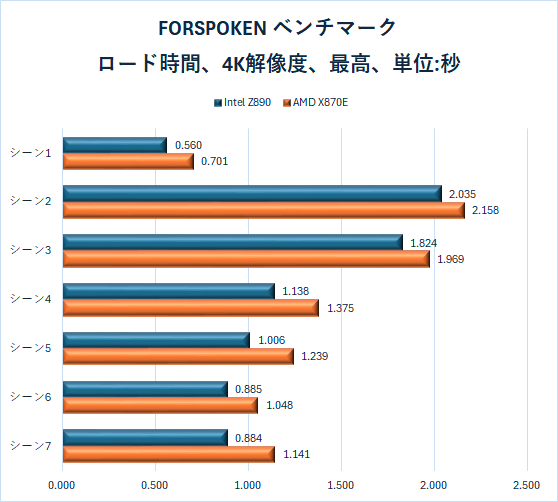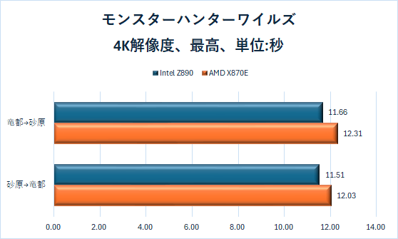 結果は「ファイナルファンタジーXIV: 黄金のレガシー ベンチマーク」と異なり、「FORSPOKEN」、「モンスターハンターワイルズ」ともに、インテル Z890環境のほうがロード時間が短くなっている。