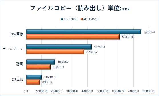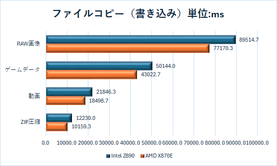 多用することは少ないファイルのコピーだがその差は明らかで、最も容量が大きくファイル数も多いRAW画像のコピー(9100 PROからの読み出し)では、AMD X870E環境が14秒も短くなっている。そのほかのコピー時間も、インテル Z890環境のコピーに要した時間は、AMD X870E環境の80%強といったところだ。