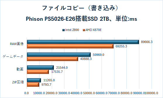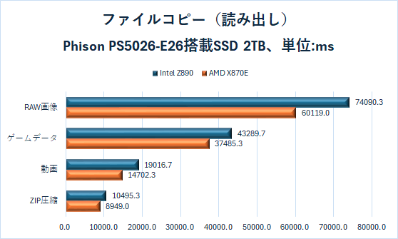 ファイルコピーに関しては、読み出し、書き込みSSDをPhison PS5026-E26コントローラーを搭載した2TBでも試したが、結果は9100 PROと同じ傾向になっていた。参考として結果を出しておこう。