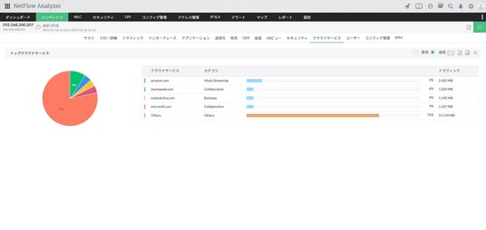 クラウドサービス別のトラフィック量の円グラフ表示画面