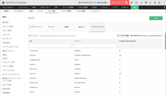 NetFlow Analyzerのクラウドサービスマッピング機能では、リスト上のクラウドサービスに関連するIPアドレスを表示できます。2025年6月より本機能が強化され、製品開発元のZoho Corporation がクラウドサービスのリストを作成し、リストの情報が最新のデータに自動で更新されるようになりました。これにより、Zoom(zoom.us)やMicrosoft 365(office.com)、ChatGPT(chatgpt.com)などのクラウドサービス別のトラフィック量を把握し、さらにIPアドレス情報をクラウドサービス名へ名前解決することが可能となります。