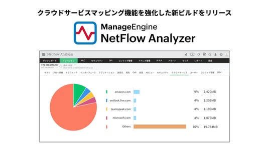 ゾーホージャパン株式会社(代表取締役:マニカンダン タンガラジ、本社:横浜市、以下、ゾーホージャパン)は、トラフィック解析ツール「NetFlow Analyzer」の新ビルド(12.8.407)を提供開始したことをお知らせいたします。この新ビルドではクラウドサービスマッピング機能を強化し、自動的にクラウドサービスのIPアドレスを最新の情報に更新して、クラウドサービス別のトラフィック量を把握できるようになりました。