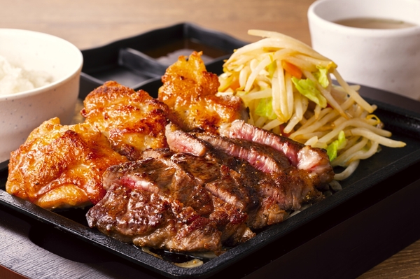 熟成ビフテキとチキテキ(チキンステーキ)のコンボ定食。ボリューム満点の一品です。