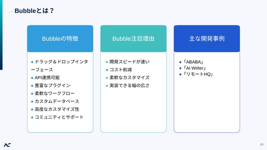 2021年よりノーコードツールBubbleを活用した受託開発を開始し、これまで40を超えるサービス開発に携わる。PM、エンジニア、Webデザイナー、Bubble講師など多角的な視点で支援し、短納期・高品質な開発を提供。
