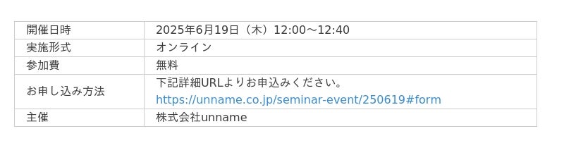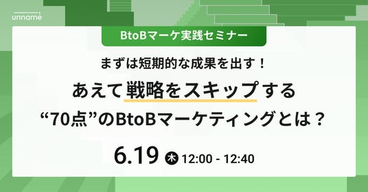 マーケティングの側面から、企業の事業成長と生産性向上を支援する株式会社unname(本社:東京都渋谷区、代表取締役:宮脇 啓輔、以下「unname」)は、2025年6月19日(木)12時より、BtoBマーケティング実践セミナー「まずは短期的な成果を出す! あえて戦略をスキップする "70点"のBtoBマーケティングとは?」を開催します。(申込先:https://unname.co.jp/seminar-event/250619)