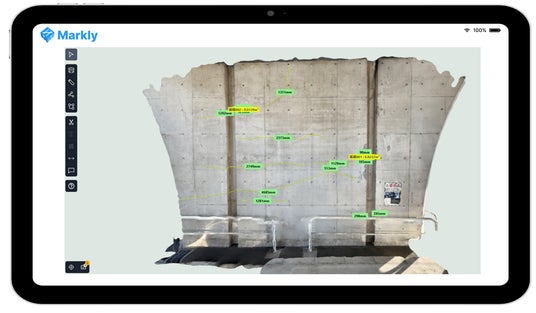 Marklyは、取得した3次元データから、構造物の補修業務に必要な損傷情報の整理および図面・帳票の作成を行うサービスです。点群・テクスチャ付データをもとにひび割れや剥離といった損傷箇所を可視化し、損傷展開図(2DCAD)や数量計算書を自動作成。クラウドシステムのため関係者間での現場状況の共有にも対応しています。