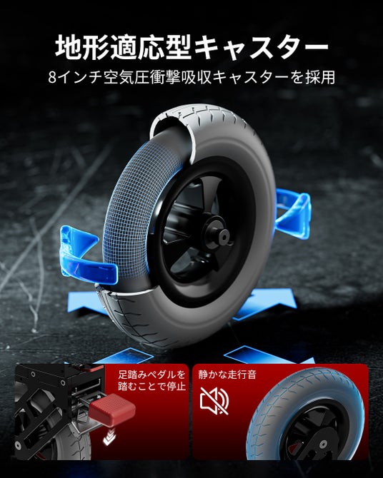 地形適応型キャスターを採用し、足踏みペダルを踏むことでしっかり停止でき、走行音も静かです。