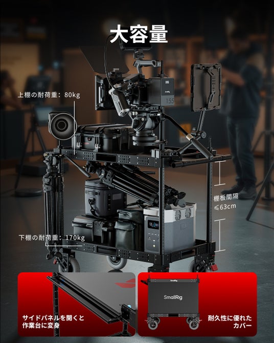 2層構造のプラットフォーム構造を採用し、上棚にはモニター、ノートパソコン、ワイヤレストランスミッター、バッテリーを接続するための複数のアクセサリーポートを提供し、下棚には大型機材を安全に収納できます。大容量と耐荷重を実現し、移動中でも機材を安全に運ぶことができます。また、サイドパネルを開くと、数秒で作業台に変身できます。耐久性、耐摩耗性に優れたカバーもご用意しています。