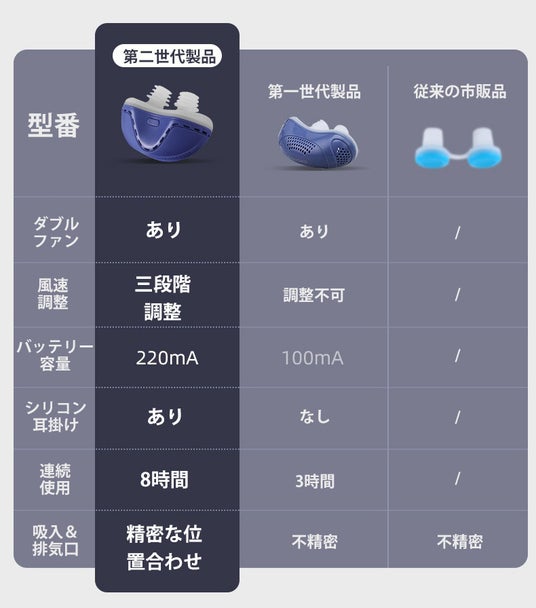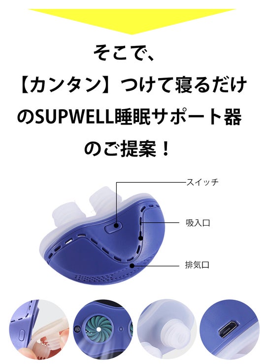 本製品は、2つの小型ファンを内蔵し、鼻腔内にやさしく空気を送り込む設計です。比較的静音設計のため、就寝中でも気になりにくく、安心してご使用いただけます(※完全な無音ではありません)。