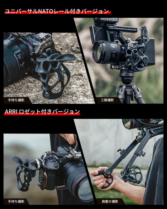 「Liquid」ハンドルは360度回転可能で、洗練された中空設計を採用し、超軽量で個性的かつスタイリッシュな外観を誇っています。NATOクランプとARRIロゼットの二つのバージョンが用意されています。