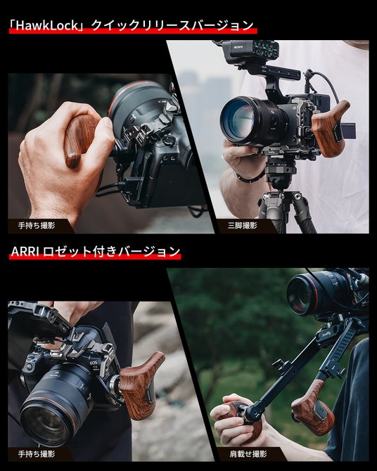 「ImageGrip」シリーズの回転式カメラハンドルは木製ハンドル、「Liquid」ハンドル、そして「Eagle」ハンドルを取り揃えています。木製ハンドルは360度回転可能で、人間工学に基づいた曲線と自然な木肌の美しさを見事に融合し、NATOクランプとARRIロゼットの二つのバージョンが用意されています。
